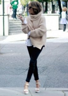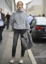 The collar is a high, long wrapped collar. For several years this type of gate has taken one of the leading positions. A sweater with a collar in the form of a collar gives the bow to femininity, as it beautifully emphasizes the elegance of the neck. Such an element looks unsurpassed against a voluminous sweater.