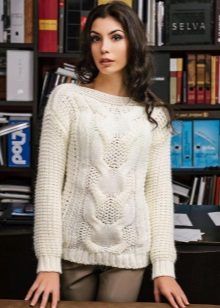 Sweaters of large knitting, decorated with an openwork pattern are in great demand. They look feminine and elegant. Many collections have knitted stitch sweaters with this type of collar. They will help to embody a cozy and stylish bow.