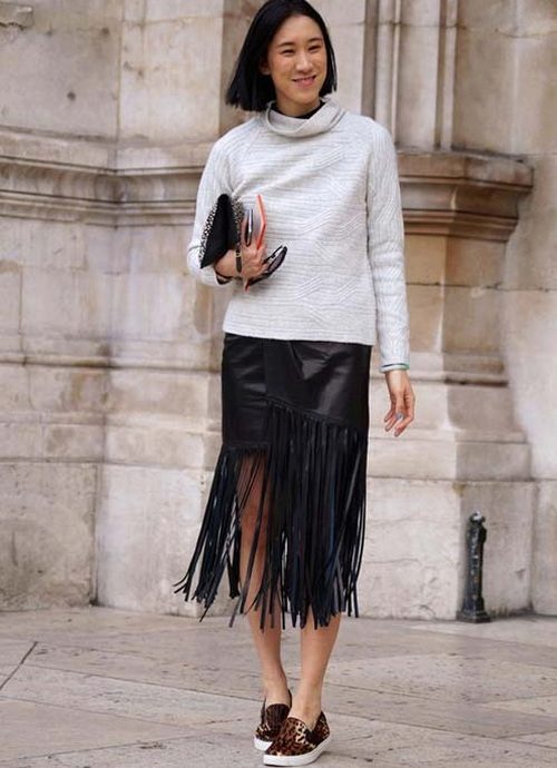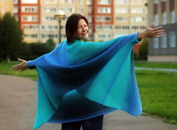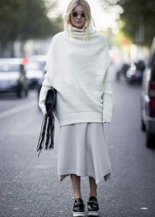 An asymmetrical sweater at the peak of popularity today. It allows you to show your individuality, to embody an unusual and unusual bow.