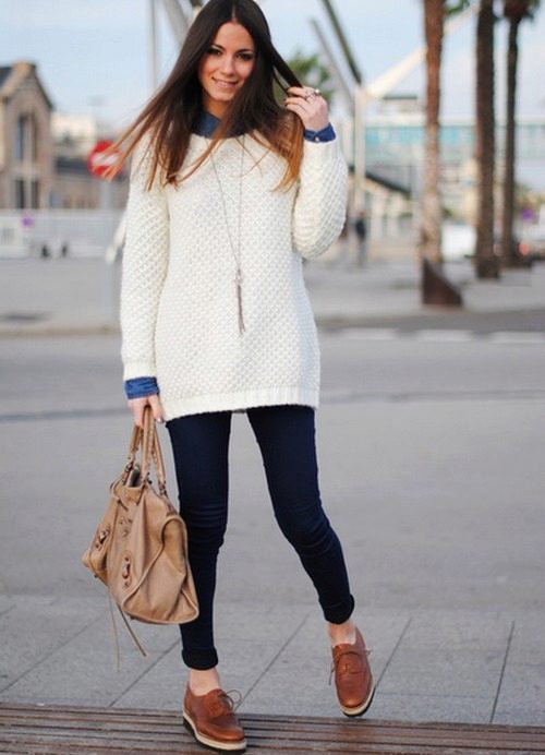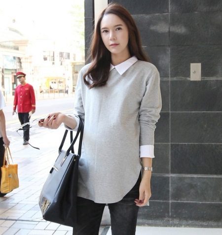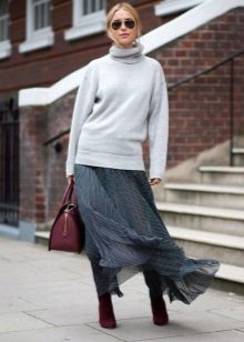 Warm sweaters with different types of collar can be safely worn with jeans as a straight, and fitting cut, or with pants. A very popular combination is a sweater with a collar and a maxi skirt.