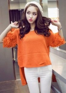 Designers offer trendy asymmetrical sweaters that are shorter in the front than in the back. Such a cut allows you to make the silhouette slimmer. The image becomes more feminine and easy.
