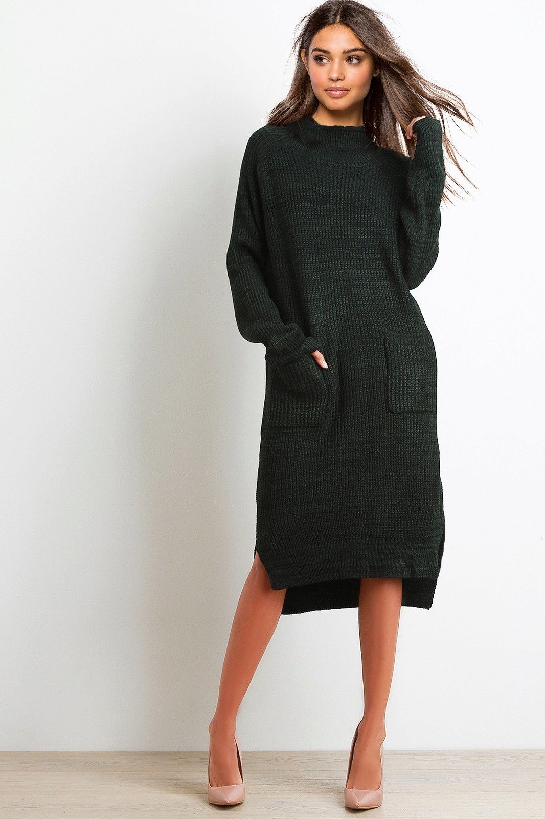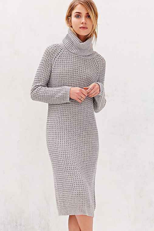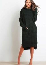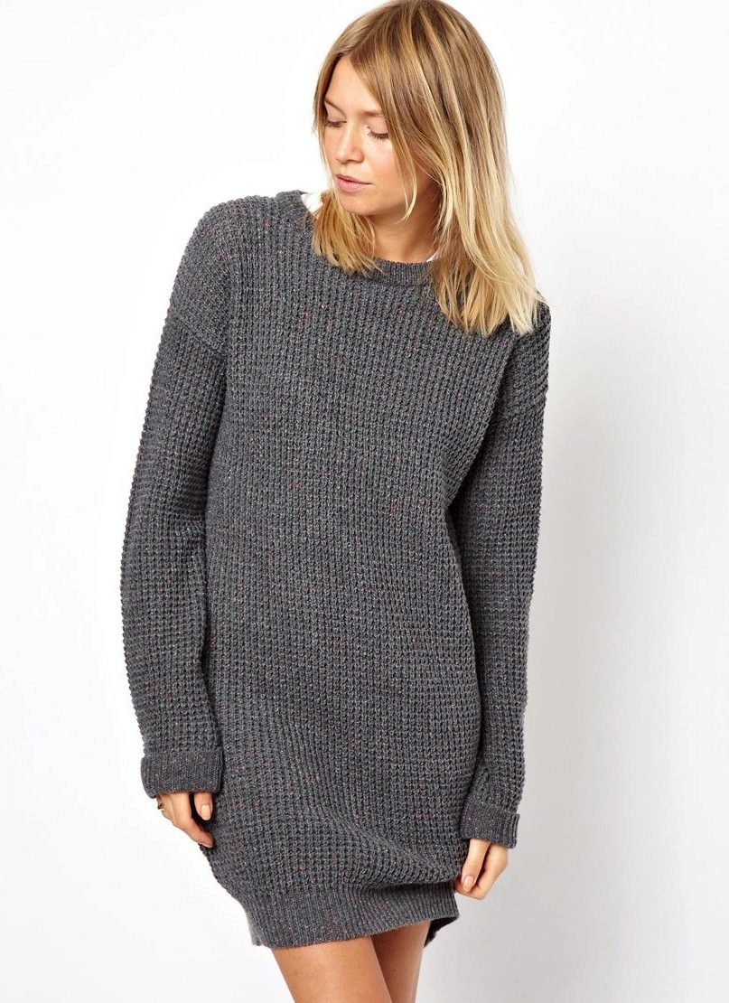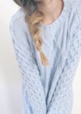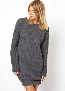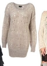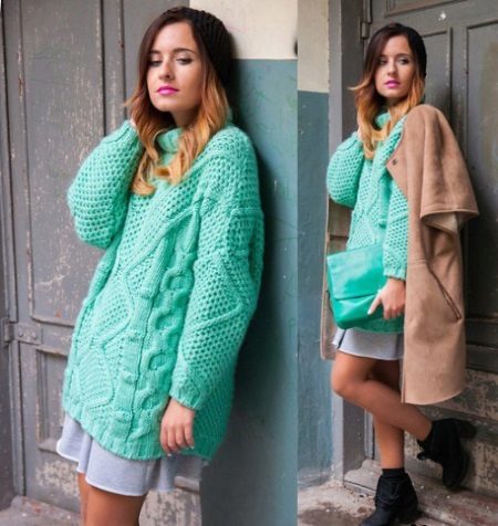 A very unusual way to wear a sweater is to combine it with a knitted dress. To do this, you will need an elongated sweater of a menthol color, having a free style and decor in the form of openwork knitting, as well as a gray dress, without any prints, which are about twenty centimeters below the sweater.