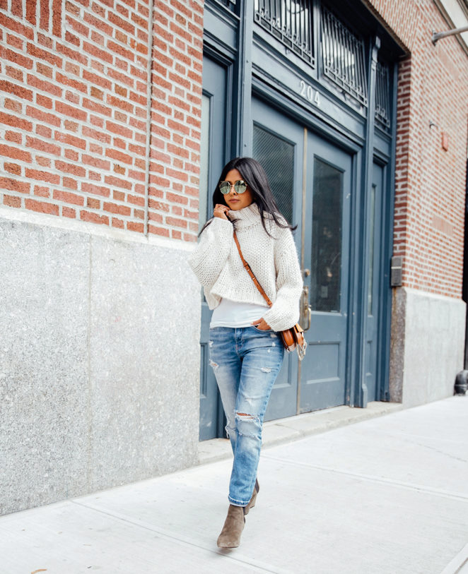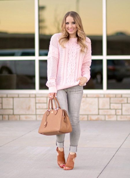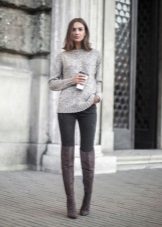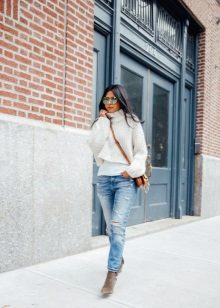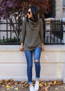 A stylish look, perfect for an informal pastime, It is obtained with a combination of black tight jeans with torn knees and a gray sweater, a free cut, the front side of which is made in the technique of a purl. It is advisable to choose a model of standard length, with a high loose collar, which can be rolled up several times - this will give the image some restraint, which will be very interesting to look with hooligan ripped jeans.