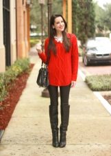 Combining this sweater with a classic white cotton shirt, it is worth a little to bend the sleeves, as well as the bottom of the sweater, so that the cuffs and bottom of the shirt look out from under the thick warm product - this will give the image a slight element of sloppiness that is incredibly stylish this season. Complete with a pleated black miniskirt and tight black tights and ankle boots with heels, the image will be light, perky and youth.