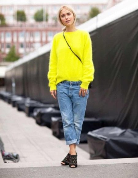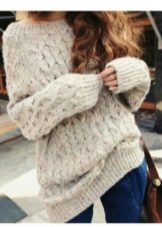Knitted sweaters are perfectly combined with other items of clothing, provided the correct choice of style and length of the product.