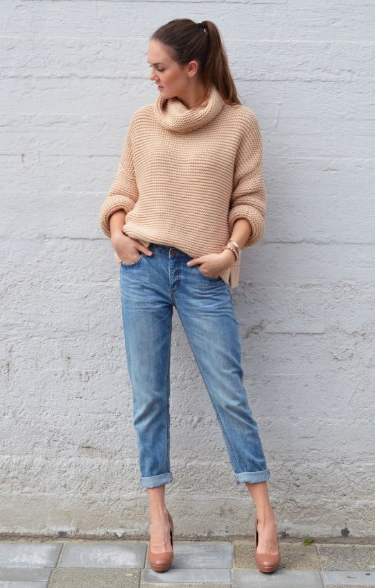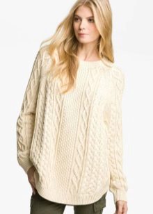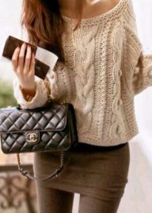 It is worth remembering the main rule when choosing a volumetric bottom, it is best to use the fitted model of the sweater, and if the bottom is tight and narrow, then volumetric sweaters will do.