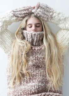 Models of large-knit, as well as coarse and thick, especially in combination with things, are made of lighter flowing fabric. Such a game on contrasts looks incredibly feminine and very beneficial emphasizes the dignity of the figure, and on the contrary it hides the disadvantages.
