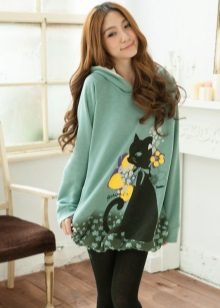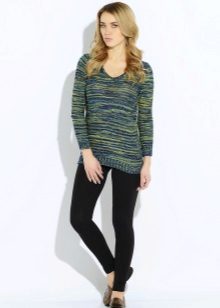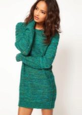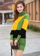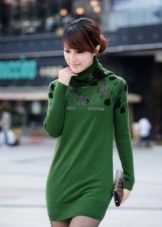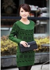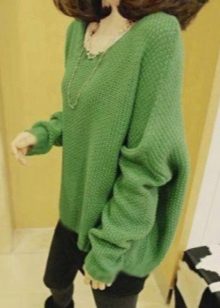 The sweater can not only be combined with jeans, pants, skirt, shorts or leggings, but also be worn as an independent piece of clothing. For example, like a dress. An elongated green knit dress goes well with black shoes and accessories.