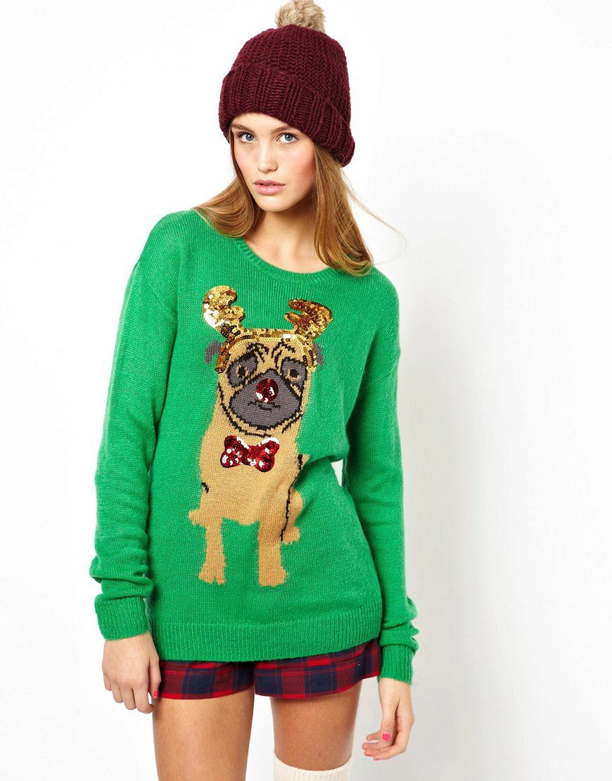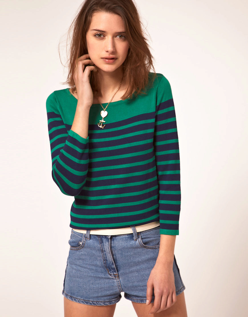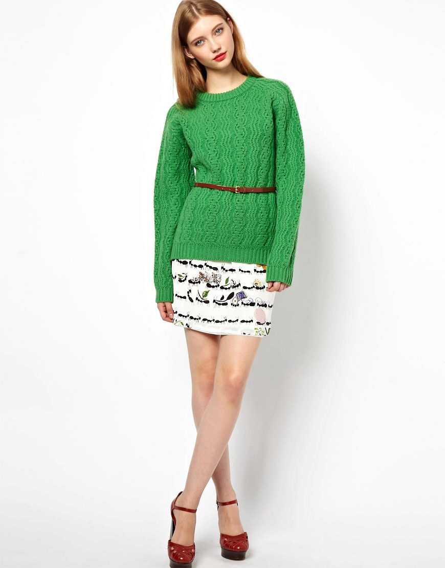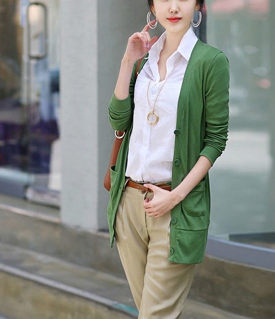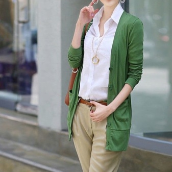 Among other colors that blend harmoniously with a green sweater, white, soft coral and mustard can be noted.