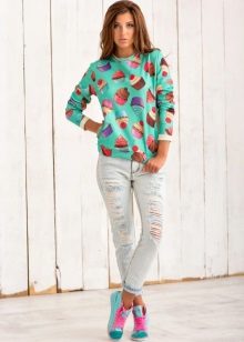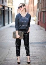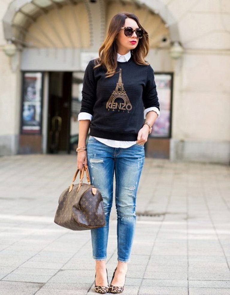 And if the sweatshirt has a more sporty appearance, then the sweatshirt is quite harmoniously combined with such classic things as pants with arrows or a white cotton shirt, as well as various shoes with heels.