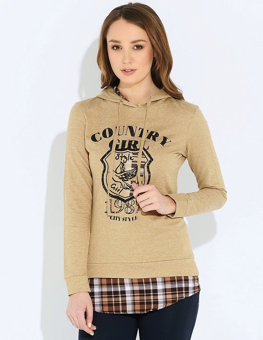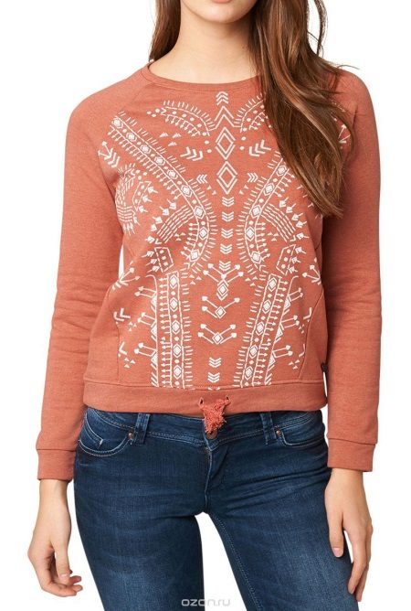 - Delicate model from TOM TAILOR: a beautiful peach-colored sweatshirt is decorated with a small pattern. The product consists of polyester with the addition of cotton fibers. The average price is 4000 rubles.