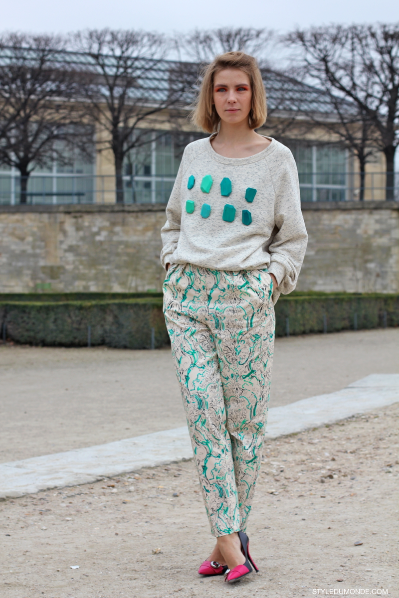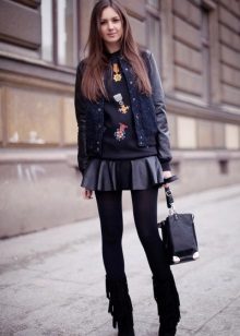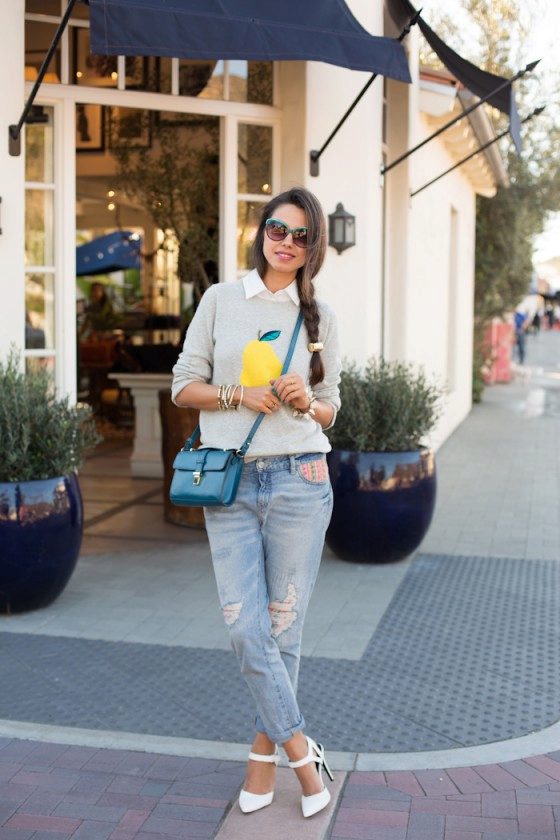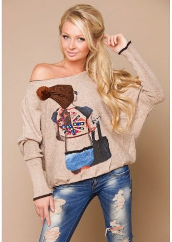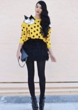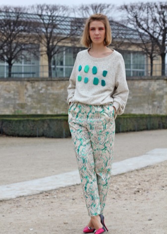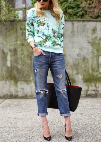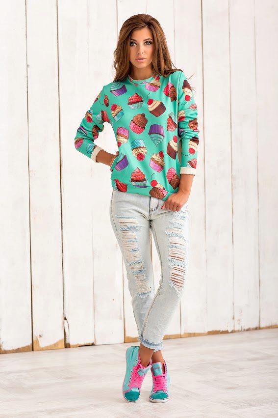 A bright sweatshirt goes well with jeans or a denim skirt. From above you can throw a denim jacket and a bright, stylish look is ready! As shoes for this set, you can use sneakers, and ballet flats, and even sneakers.