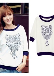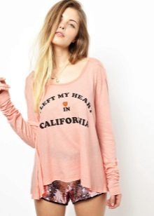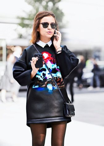 Another popular model is a mid-thigh sweatshirt. The lower part of this model is planted on a wide cuff of elastic. This sweatshirt is perfectly combined with jeans or pants.