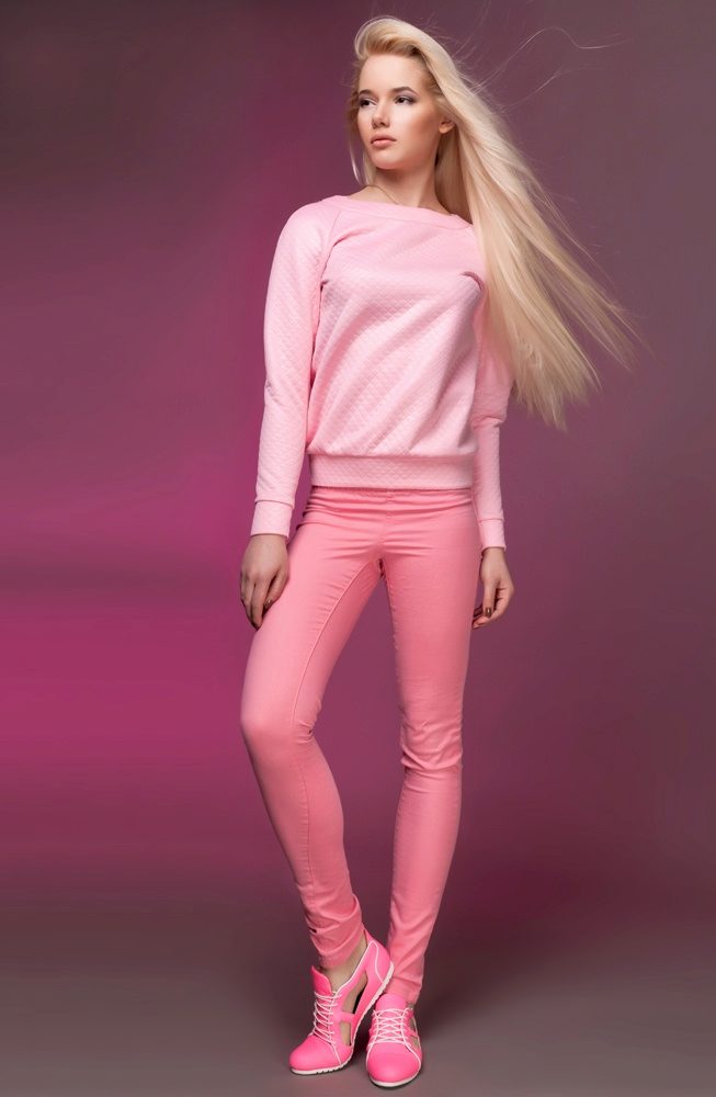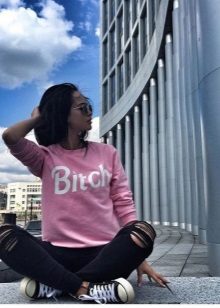 The pink sweatshirt can be worn with a midi skirt made of genuine black leather, the contrast always looks bright. For those who like the style of "Barbie" you can pick up a completely pink bow. The pink sweatshirt and torn pants in combination with sneakers will be a bright and original way.