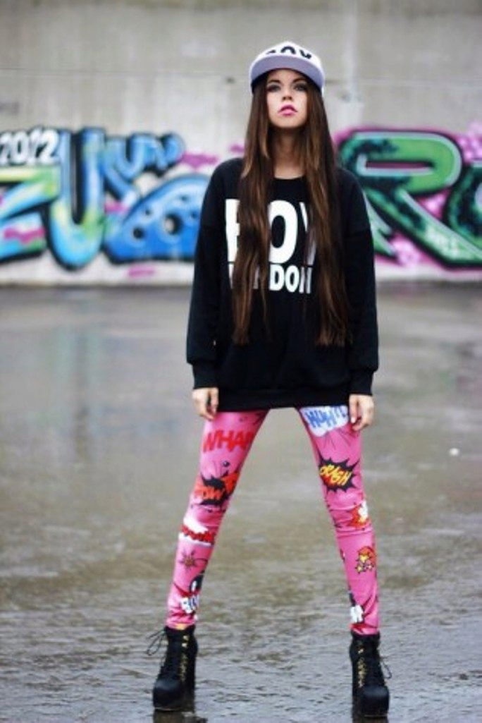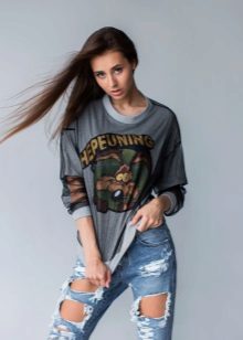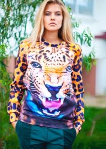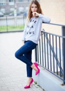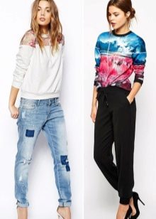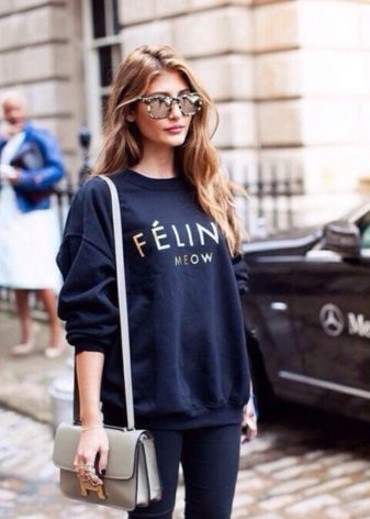 Printed sweatshirts should be worn with a single bottom. These can be jeans, trousers, skirts, leggings and even tights. The image in which the color of jeans or skirts is found in the figure of the top looks harmoniously. As well as a sweatshirt and a skirt or pants can be presented in a single color.