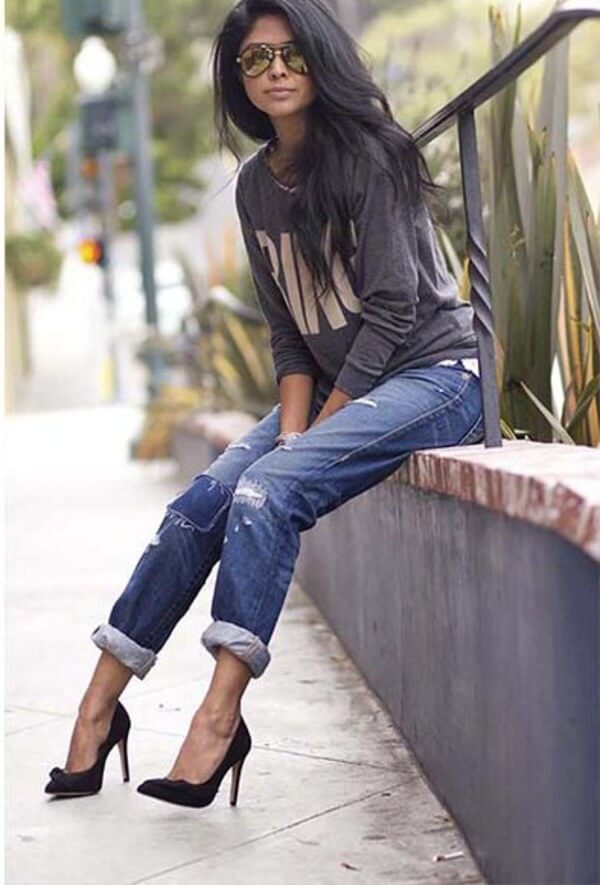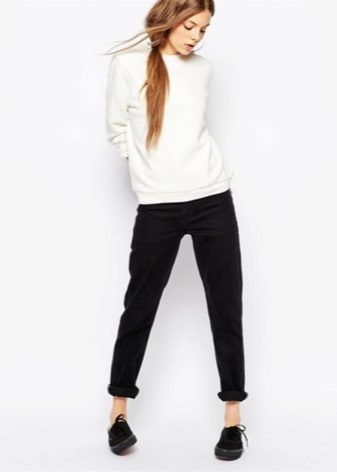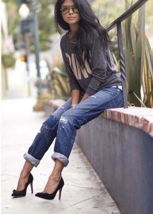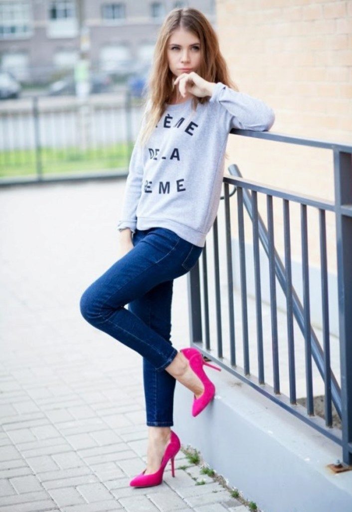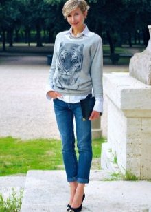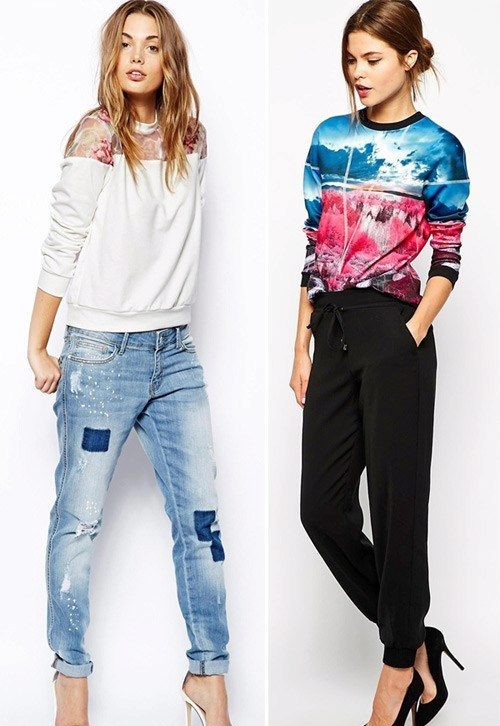 - For the embodiment of everyday bow can wear a sweatshirt with jeans.With loose models, skinny jeans are better in tune, but sweatshirts with elastic are perfectly combined with boyfriend jeans.