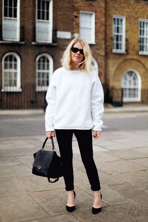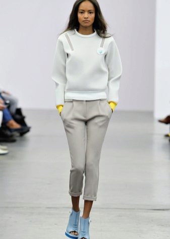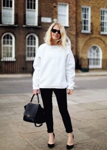 White sweatshirt is perfect for the embodiment of an interesting bow. When choosing a bottom is to give preference to satin trousers of a dark shade. With this outfit you can even wear shoes with thin soles. Also, a more extravagant bow can be combined with a white sweatshirt.