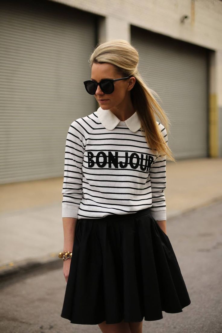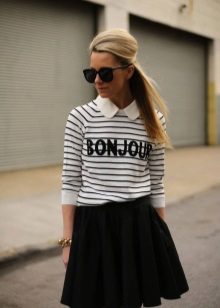 A white sweatshirt with a white lettering can be worn with a striped skirt. A black clutch and stiletto sandals, as well as black-framed glasses, will complement the bow.