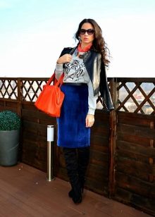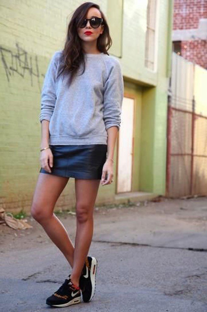 - A leather skirt with a sweatshirt looks unusual and stylish. The original tandem is a silk skirt with a bright sweatshirt.