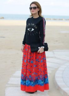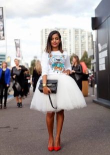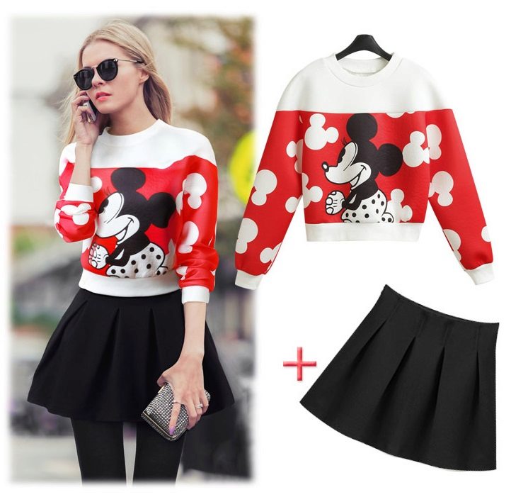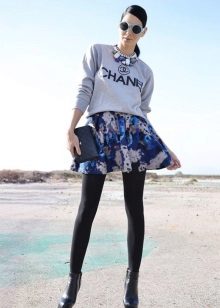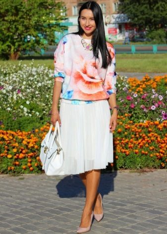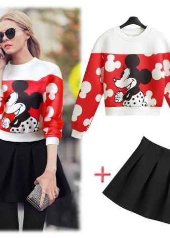 A white Mickey Mouse sweatshirt can be worn with a short A-line skirt. A floral print upper can be combined with a light white skirt. Selection of color solutions looks harmonious and stylish.