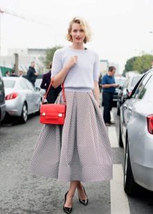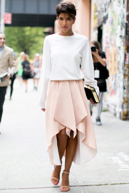 A snow white sweatshirt in combination with a flared skirt of soft pink shade is ideal for the festive event. Graceful sandals in a skirt tone harmoniously complement the image. Looks smart clutch bag in black with gold inserts in the form of a book.