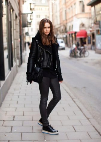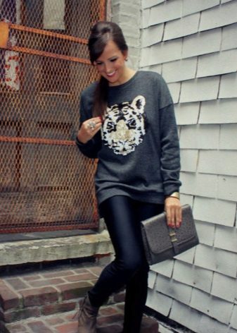 - With an elongated model, you can wear leggings, but only from thick fabric. Such a sweatshirt will completely close the buttocks, and the silhouette will appear slimmer.