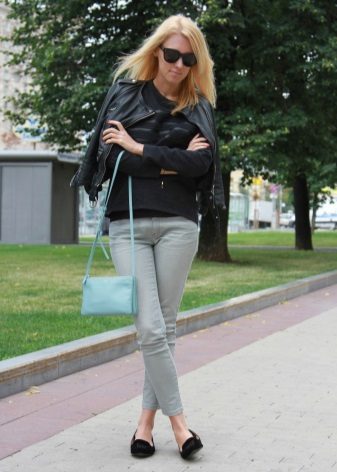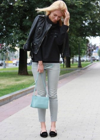 Plain dark-colored sweatshirts are often combined with light denim trousers. You can wear your favorite "puff" bow - T-shirt + sweatshirt + leather jacket. A reminder of a good and bright mood will be a mint-colored clutch.