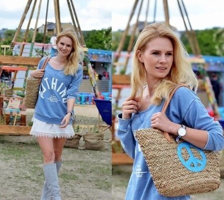 Inscription sweatshirts are often used to create stylish casual bows. For example, a blue sweater with an inscription of white color of a classic cut can be worn with a summer skirt and high boots. Interestingly in the bow fits woven bag with the emblem of the same blue color.