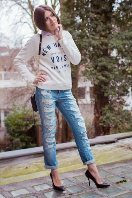 The combination of a white sweatshirt with an inscription of blue color over a striped shirt that looks and refreshes a unique bow looks feminine and elegant. Ripped cut-off jeans fit perfectly into a stylish youth look. Black high-heeled shoes will add a femininity bow. An excellent addition will be a clutch bag to match the shoes.