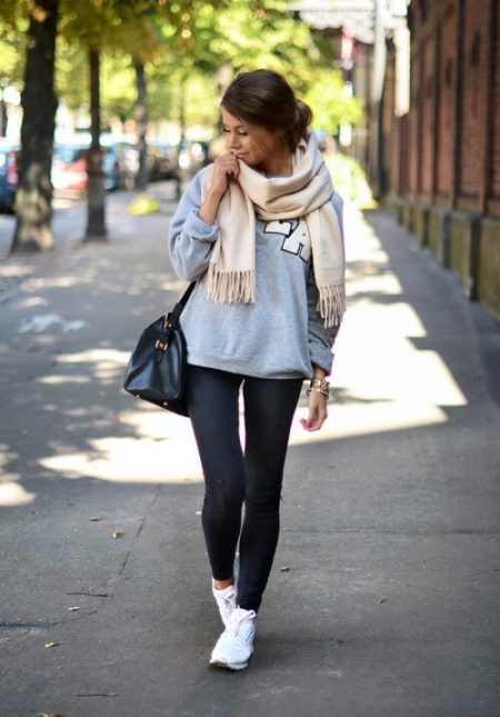 For a casual look, you can wear a gray sweatshirt with the popular abbreviation "LA" in tandem with black skinny jeans. White sneakers and a wide cream charm will add freshness and glamor to this look. A roomy bag in tone jeans perfectly complement the fashionable image for every day.