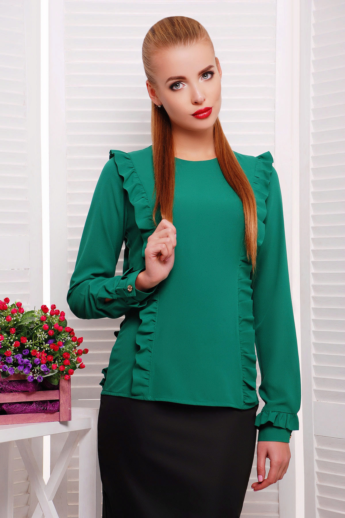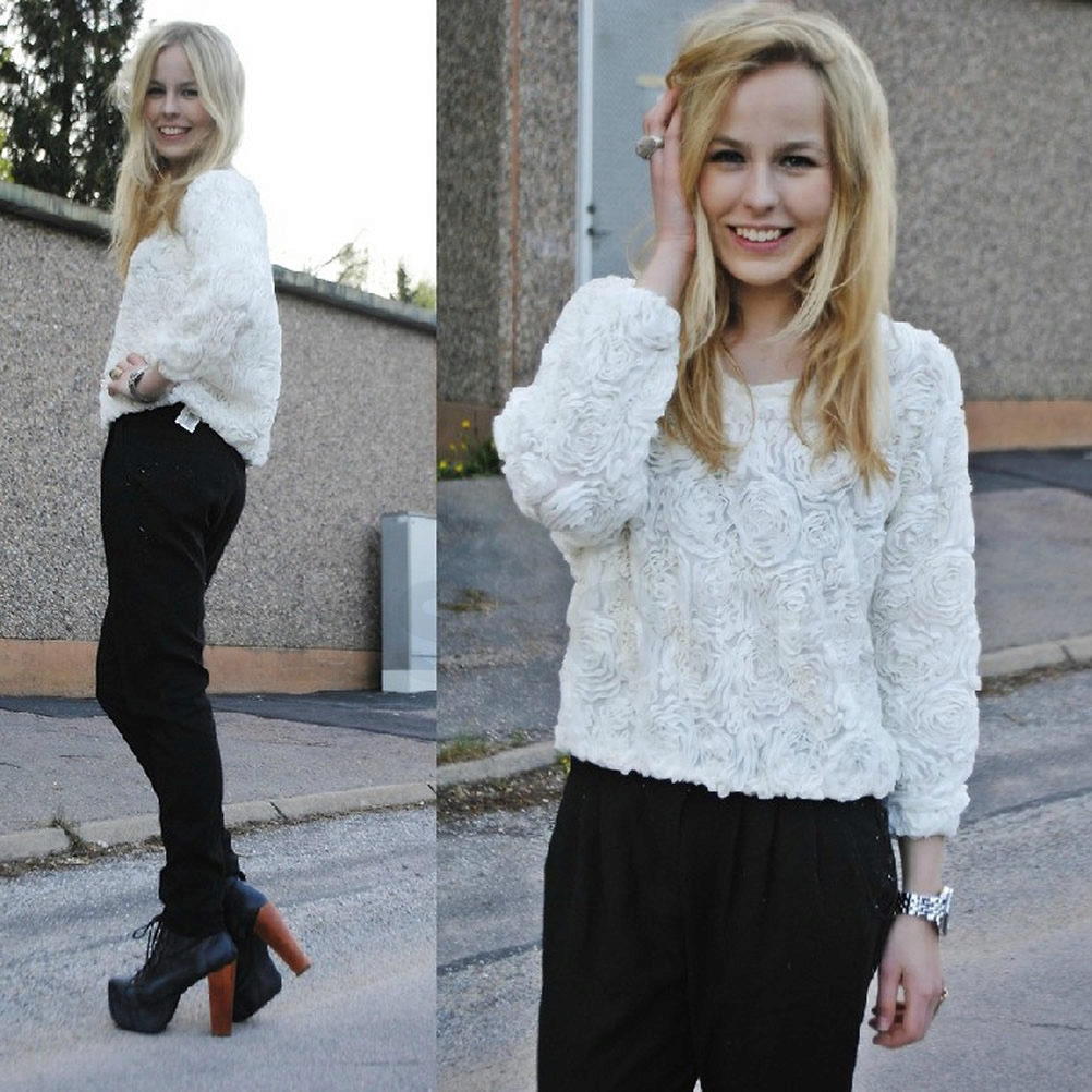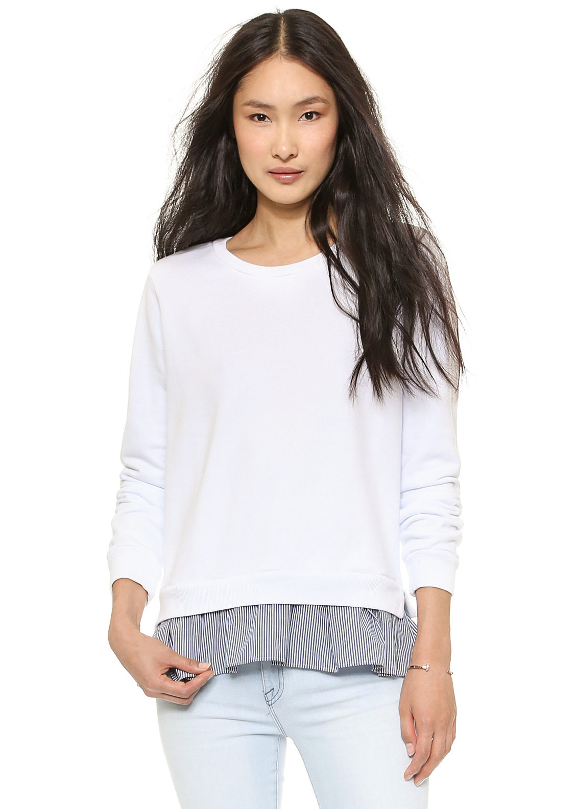 Since the sweatshirts with frills look very elegant, you can try to combine it with different models of a pencil skirt and create an image suitable even for a festive occasion.