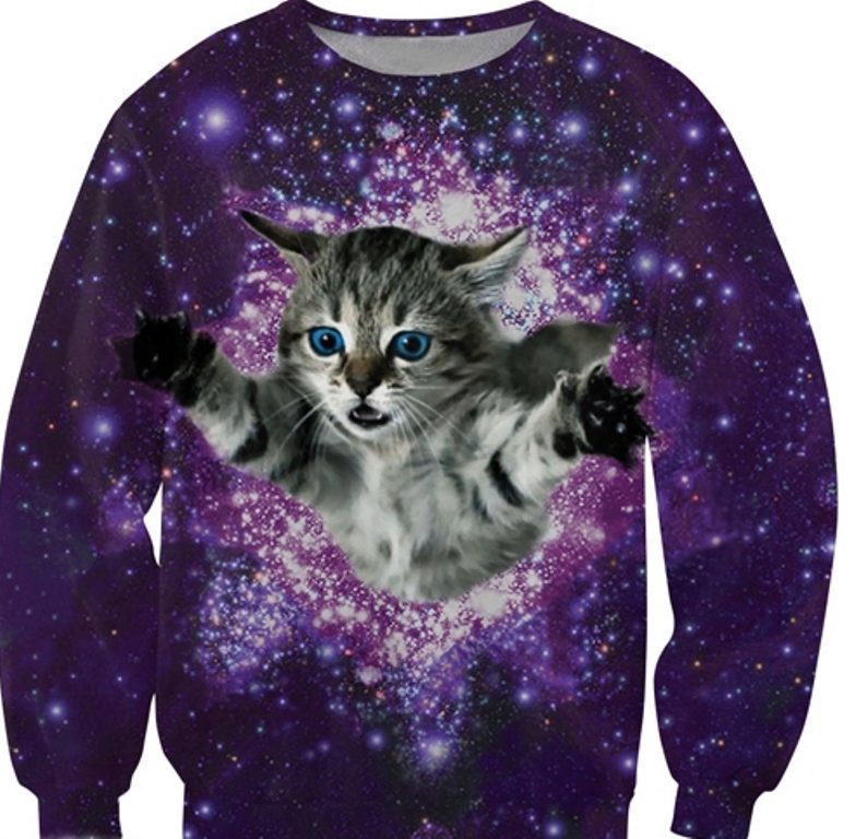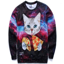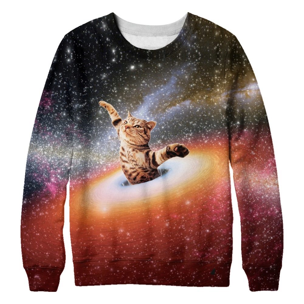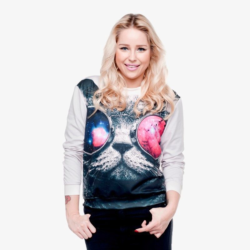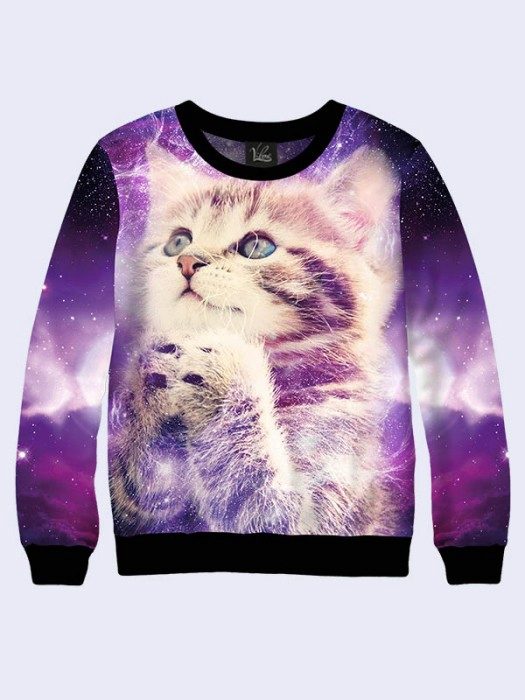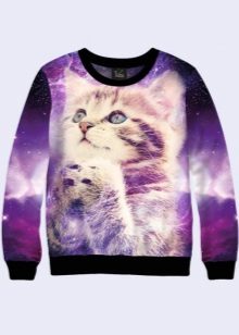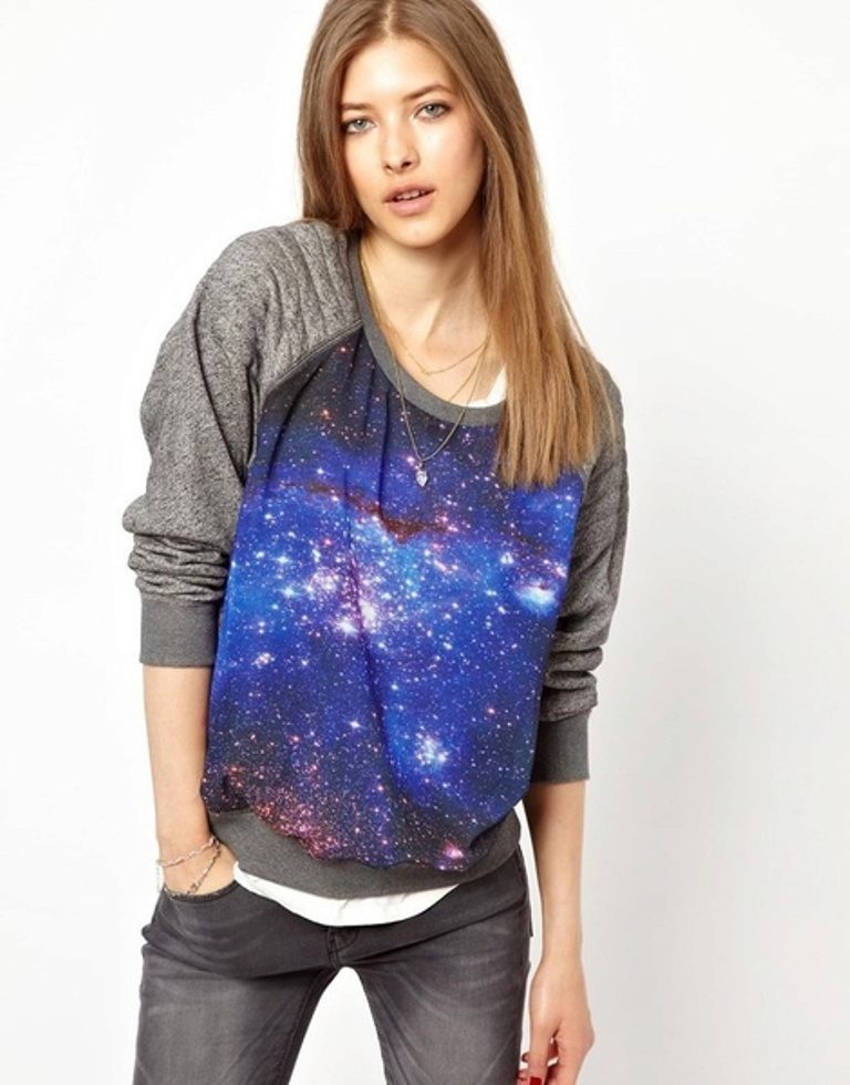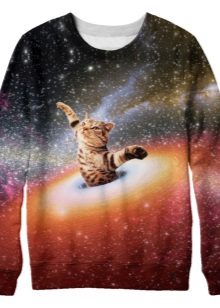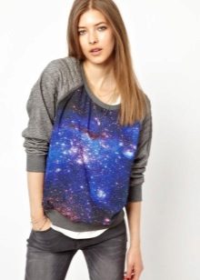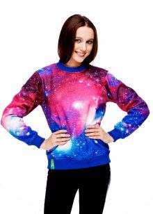 Cosmic motifs are often found on sweatshirts. Such an unusual print will help to express your inner world, and a sweater will decorate your wardrobe. Stars, planets, clouds are used to decorate only the sleeves or the entire product.
