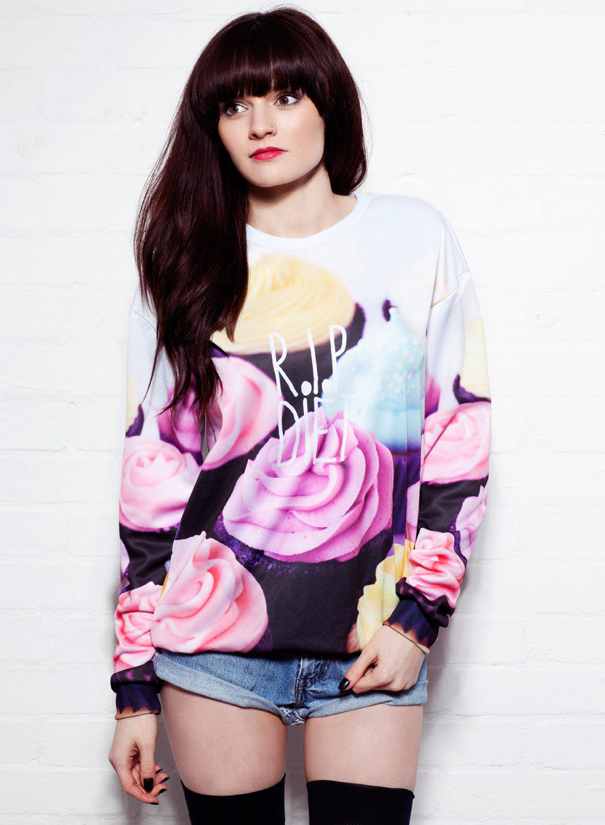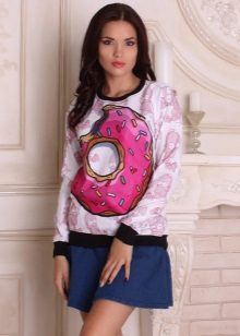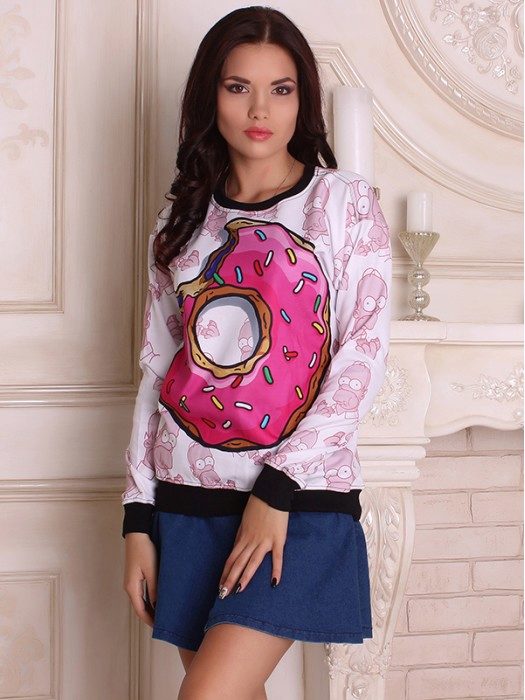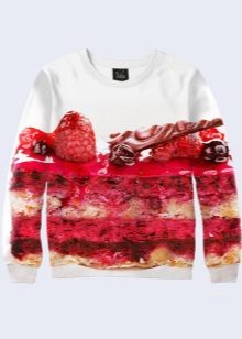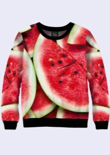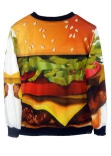 Bright and creative look sweatshirts with food. Many models are decorated with fruits - pineapples, bananas, watermelons. A delicious pie or donut will surely make those around you want it. The model decorated with bread looks extraordinary.