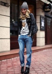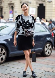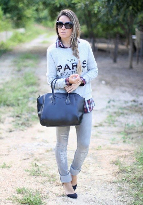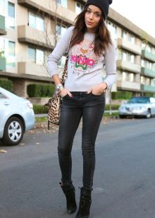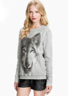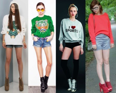 For the embodiment of an attractive and fashionable image is not necessary to choose a sweatshirt of bright color. For example, a gray sweater with a print looks great in a tandem with short shorts, and black suede boots with high heels will add a bow of sexuality.