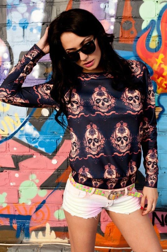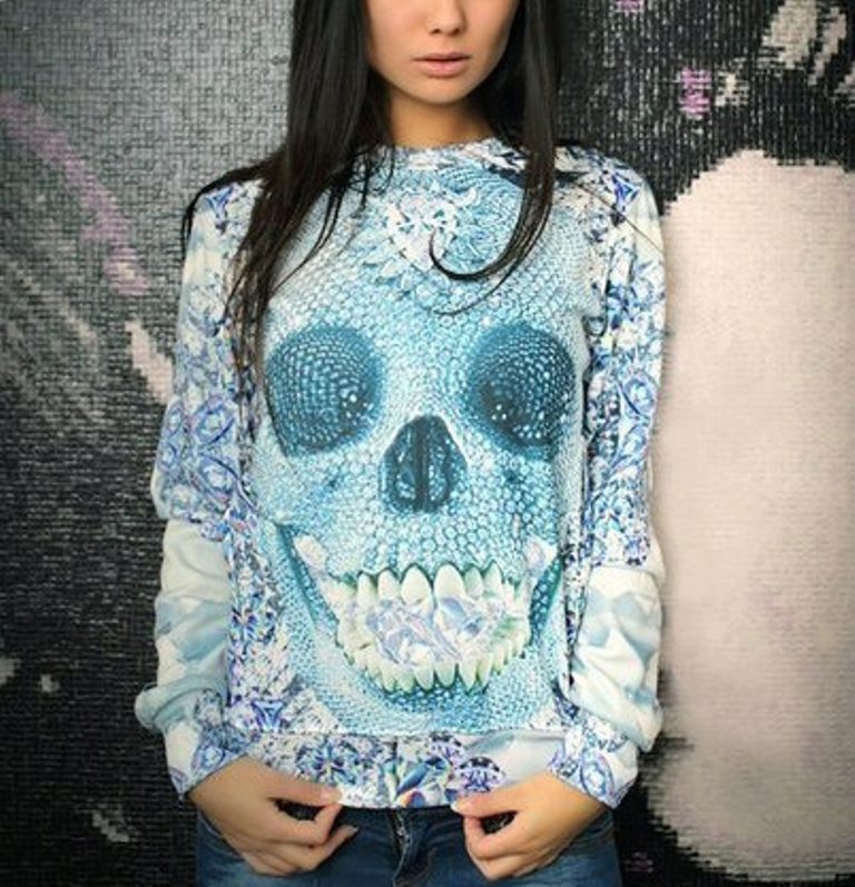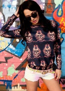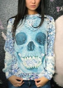 Models with skulls are also in demand. Such an extraordinary print has long been used to decorate clothes, because for the first time it appeared on the uniforms of Europeans back in the XVIII century. The girl in this sweatshirt will always be the winner.