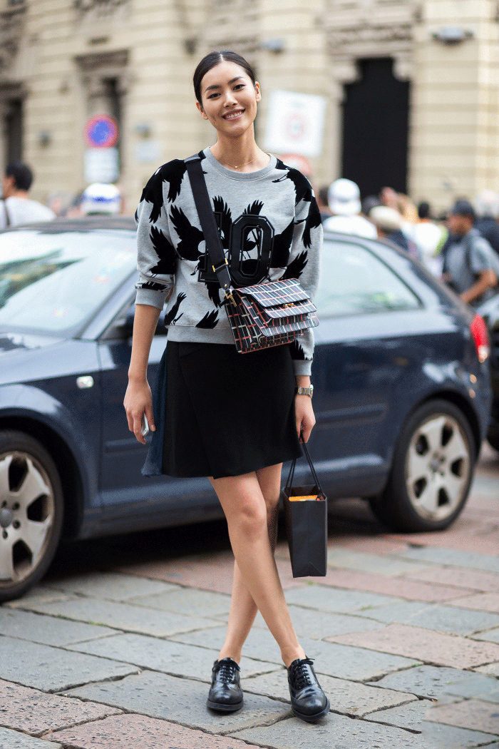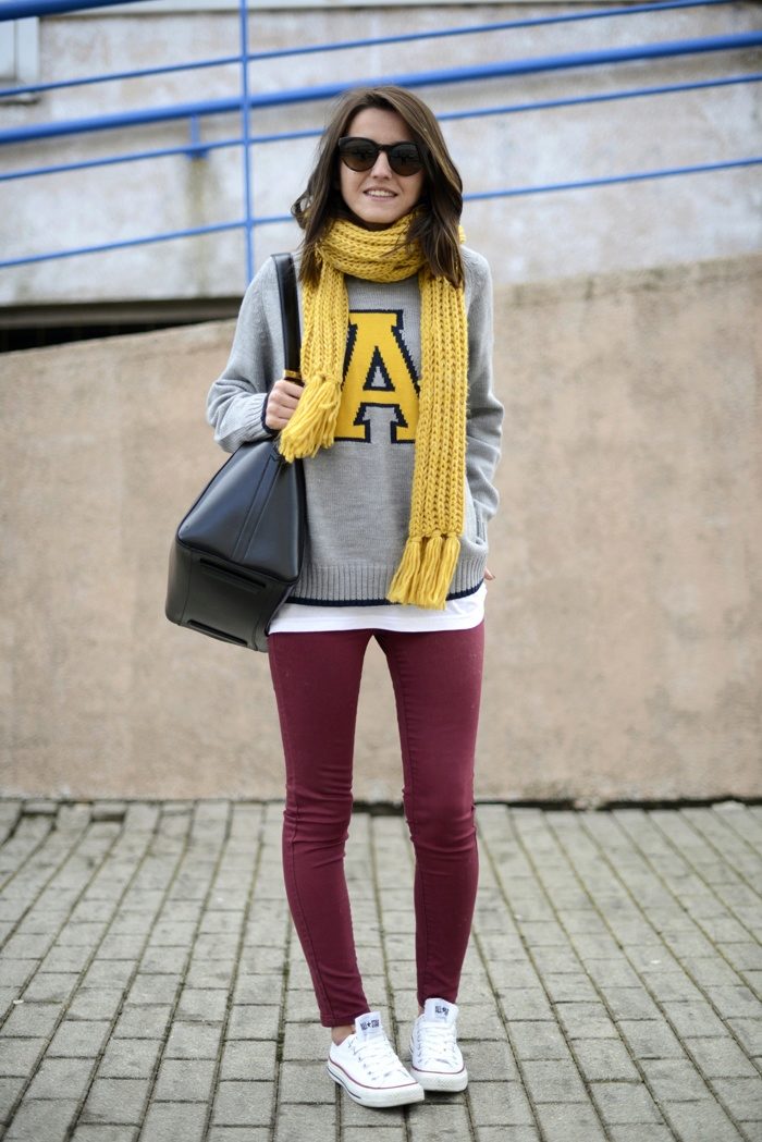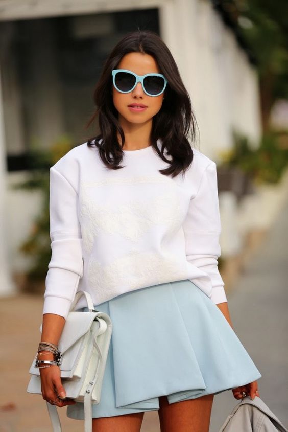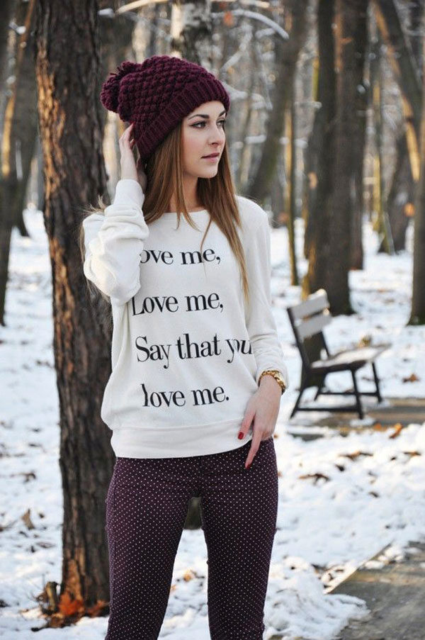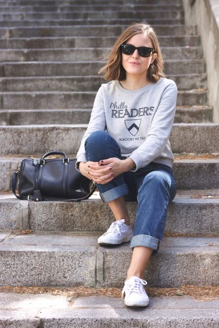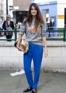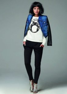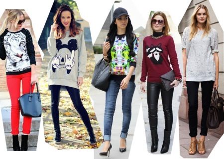 Sweatshirts with prints look stylish with skinny jeans, wide-leg trousers or a skirt. Trendy bow can be created by combining narrow trousers with a denim jacket.