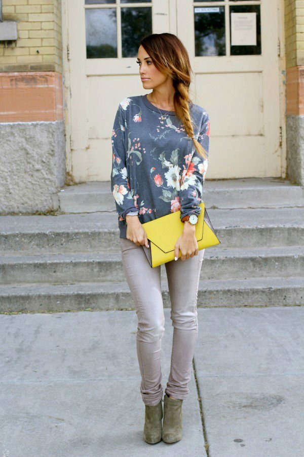A floral print sweatshirt is a great choice for an office style. It can be worn with pants or a skirt below the knee length. Sweaters in roses or poppies look elegant and feminine. A great addition to the image will be elegant shoes with heels.