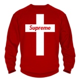 Sweatshirts along with hoodies and T-shirts are the most sold things of the Supreme brand. Often they have a flashy design or, on the contrary, aesthetically concise. The cost of clothing is quite high, due to belonging to a cult brand. Cotton fabrics and fleece are used for sewing sweaters.