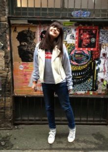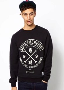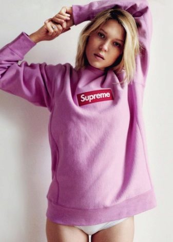 Since most models of the brand are long, you should take note of the combination of sweatshirts with tight jeans, leggings or short shorts. A combination with mini-skirts or, if the sweatshirt is of a more traditional look, with long floor lengths of flying fabrics is not excluded. Under it you can wear a shirt. From shoes suitable not only sneakers and sneakers, but also boots or shoes on the platform.