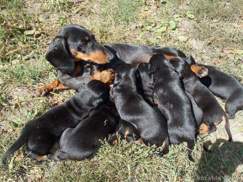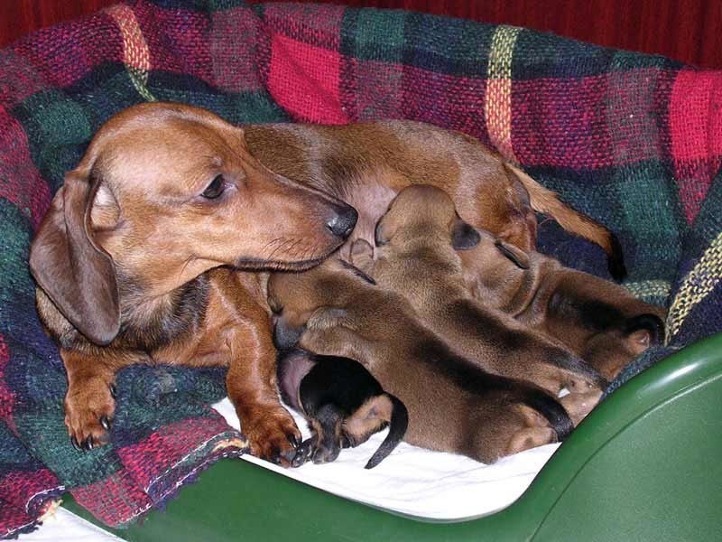 Puppies are born in biological shells, from which the dachshund is able to release them itself. She self-gnaws the umbilical cord and frees the airways of babies from mucus. After completing these processes, she can proceed to the first feeding of puppies, pushing them to the nipples with her nose. Newborn puppies do not need any special care, because the dachshund itself fully provides them with everything they need. In the postpartum period, you need to carefully monitor the nutrition and condition of the dog itself, as well as how it feeds its babies.