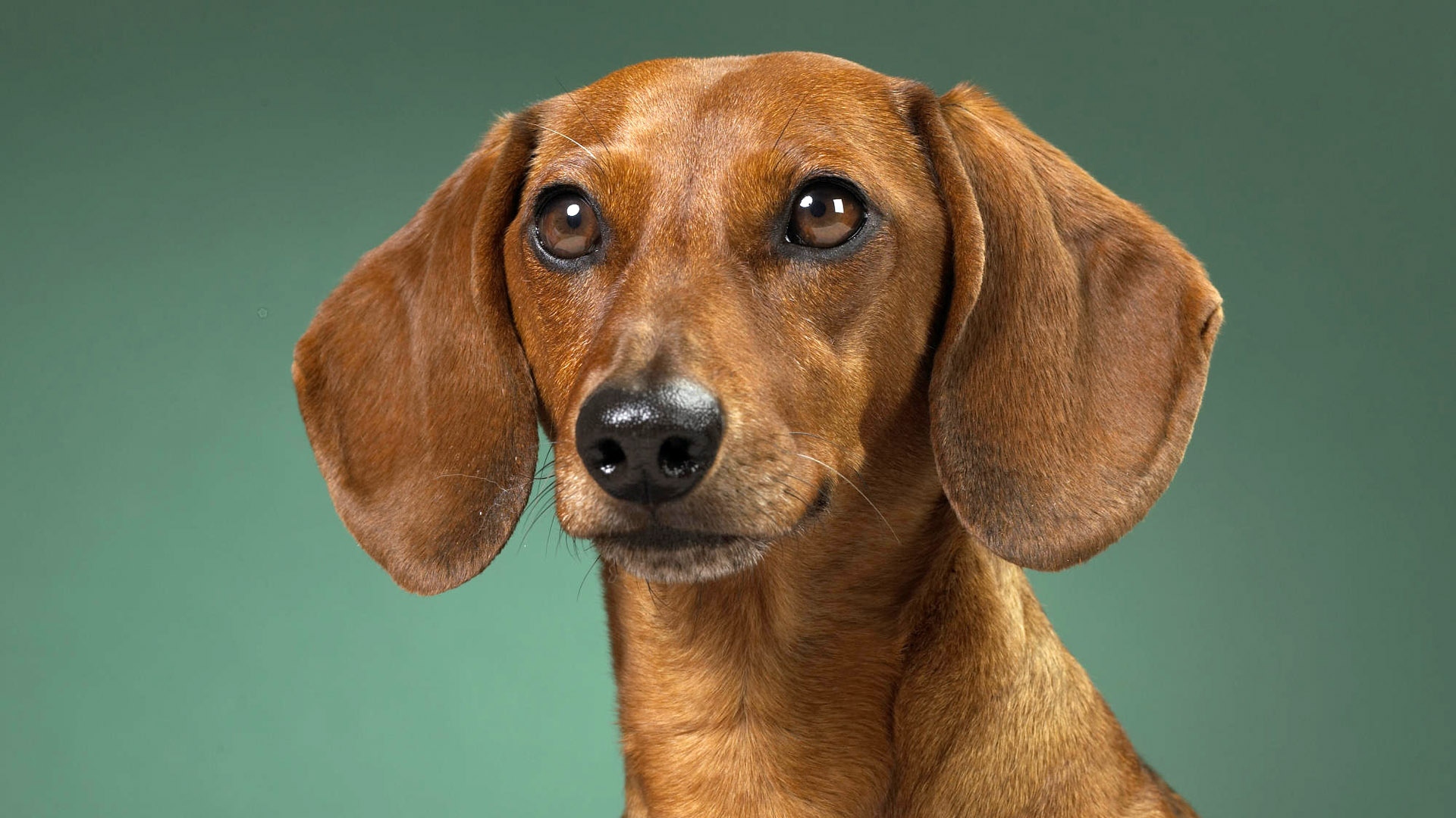 The dachshund has a well-developed nasal lobe, a massive muzzle and jaws capable of wide opening. Lips tightly abut, closing the jaw, which is well developed, filled with strong rather big teeth and steadily closed. The eyes of the dachshund are small and oval, as well as brown, black-brown and reddish. The ears are set high and the front edges lie against the cheekbones.
