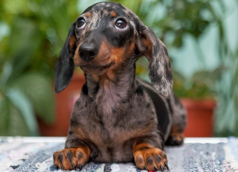 The so-called tiger dachshund is not at all like its tiger coloring. The name of this color is similar to a dangerous predator only by the fact that the spots on the body of the animal are placed in stripes, but they are not pronounced, but rather scattered. Colors with this color are most often light brown and dark chocolate.