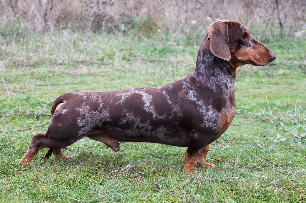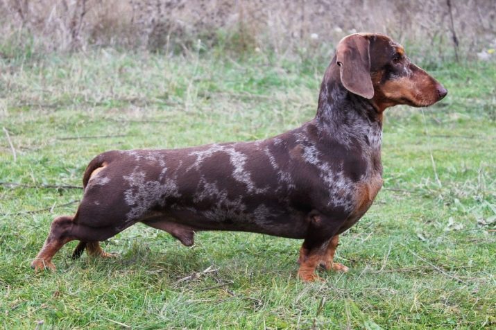 Spotted dachshund is also called marble. And all because of the characteristics of its color, which resembles the color and texture of the stone. This dog looks very nice and unusual. Most often in a marble color there is a combination of black, gray-white and brown colors.