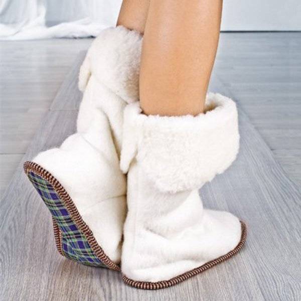 They look similar to appropriate street shoes, but are made of lightweight and breathable materials: this is usually knitwear or wool, and often fur is used. Slippers-boots with soft rubber soles are very popular among those who need to keep their feet warm on the recommendation of doctors. This model is also found in the summer and winter versions. Summer slippers boots are made of mesh materials.