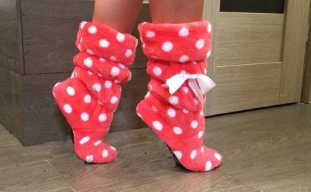 They resemble ordinary socks, but have a reinforced, compacted sole. They are different in length: and short, like socks, and long, like socks.Such slippers are very often made by hand, for example, knit from warm yarn.