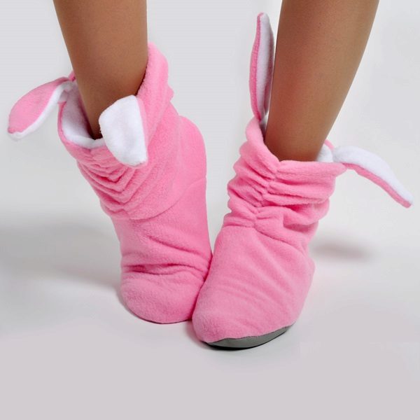 Cozy soft slippers-bunnies with a fluffy pompon tail and long ears. Sewn from bright pink fleece with white fleece trim.