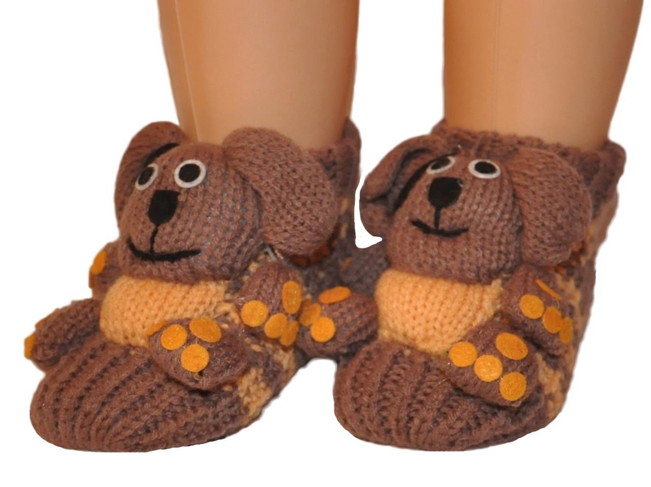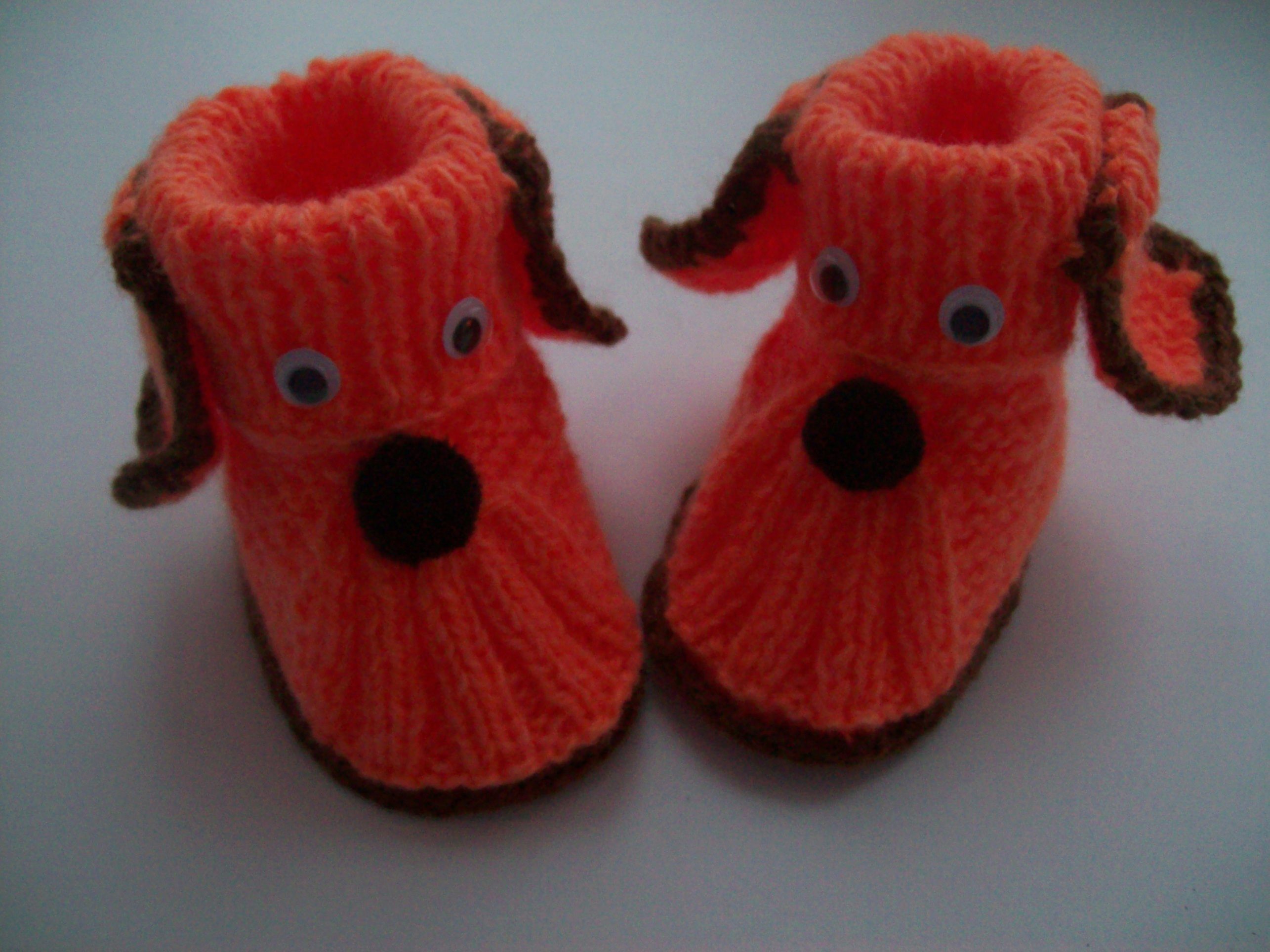Children's slippers, boots of bright orange yarn. Decorated in the form of dogs, the nose and ears of which, as well as the sole, things are knitted of thick brown yarn.