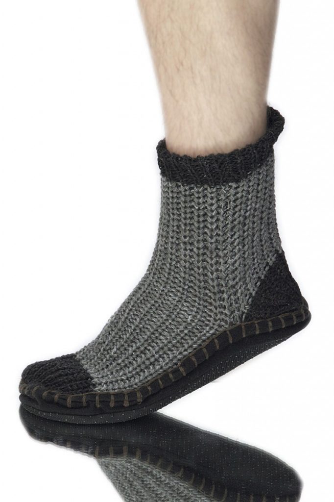 Jurabs are knitted from thick wool yarn, and a soft leather sole is sewn to the finished product.
