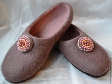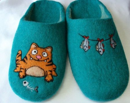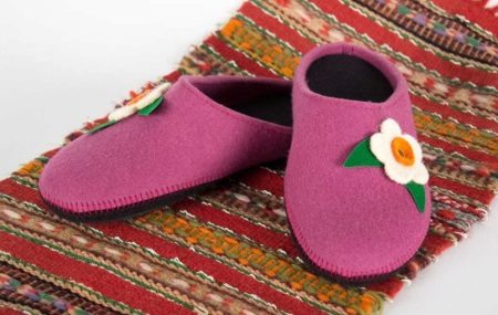 Felt slippers can also be divided by the presence of the sole. Slippers completely without soles softer and more plastic. But they are less durable and can wipe from frequent friction on the floor. The sole at felt slippers is most often sewn to an already finished product. Make it out of leather and suede, or from synthetic materials. Slippers on the sole do not slip on the floor and will last longer, retaining their original appearance.Another modern way to protect slippers from wiping from rubbing is impregnating the sole with latex. This material can be applied to the entire area of the sole, or point only in order to make the slippers more comfortable and less slippery, but at the same time leave the legs to breathe