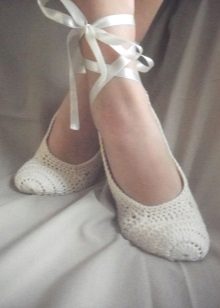 5. Japanese. A separate model of unusual home shoes. These knitted slippers are fixed on the leg with long cords tied just above the heel.